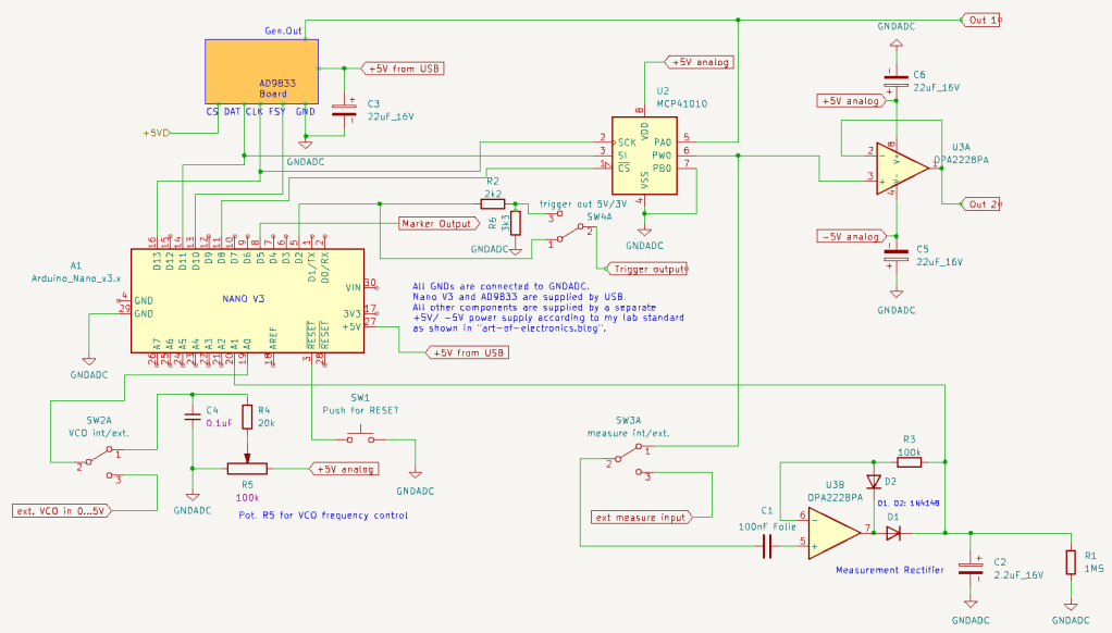 Das Bild zeigt die Schaltung, erstellt mit KiCad. Da keine Platine erstellt werden sollte – für den Aufbau war eine Lochrasterplatine ausreichend – wurde das AD9833-Board als orangefarbenes Rechteck dargestellt.