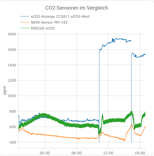 Der ENS160 lief zwar auch ein Stück weit in die falsche Richtung, folgte aber in der Tendenz ziemlich gut dem Referenzsensor. Sprünge sind nicht zu sehen.