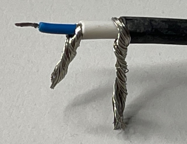 Was kommt dir in den Sinn, wenn du nach dem Abisolieren des Adapter – Ausgangs- kabels dieses Ergebnis siehst? Ein besonders gut abgeschirmtes Kabel, weil man es mit einem Schaltnetzteil mit 90 W Leistung zu tun hat? Klingt irgendwie komisch. Eine Messung zeigt, dass die äußere Abschirmung mit PE (Schutzleiter der 230V~) verbunden ist. Weitere Messungen zeigen, dass die zweite Abschirmung um den blauen Leiter offenbar mit nichts verbunden ist. Wenn ich das Netzteil einschalte, habe ich zwischen dem blauen Leiter und der äußeren Abschirmung die gesuchte Spannung von 19,5 V. Diese kann ich angeblich mit 6,5 A belasten. Leider bricht sie schon bei der Belastung mit einem 100 Ω Widerstand auf etwa 1 V zusammen. Eine Messung zwischen den beiden Abschirmungen zeigt eine Spannung von nahezu 0 V. Wie ist dieses Ergebnis zu deuten?