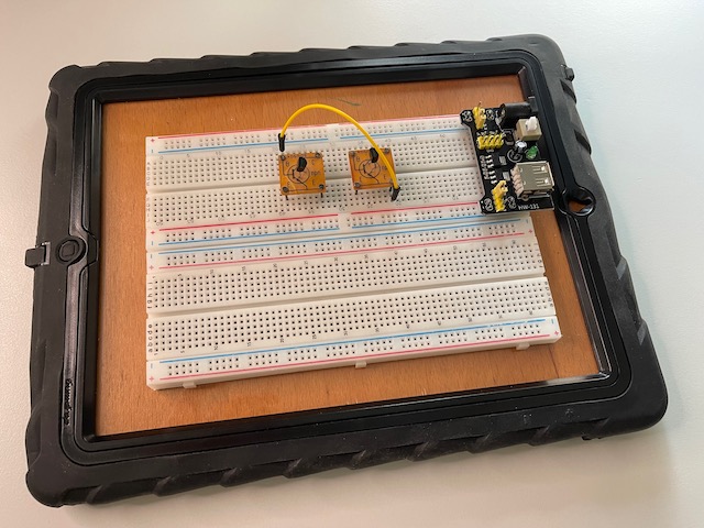 Vor einiger Zeit habe ich eine Menge von iPad – Outdoorhüllen einkaufen können. Sie dienten mal dazu, um iPads vor Beschädigungen im Outdoor – Einsatz zu schützen. Es gibt sogar eine MIL-Version. Da sie aus Gummi, also schwer und sehr griffig sind, baue ich mir sie so um, dass sie wie festgeklebt auf meinem Arbeitstisch haften. Ein Beispiel zeigt das Foto. Die Hüllen waren mal teuer (fast 60 € pro Stück), aber für iPad 3 irgendwann nicht mehr verkäuflich, somit günstig zu haben. Wo früher das iPad steckte, platziere ich eine zugeschnittene Sperrholzplatte. Oben drauf packe ich so viele Breadboard – Streifen, wie ich brauche oder gleich ein Arduino-Board … was auch immer – fertig!
