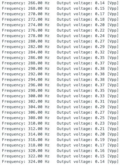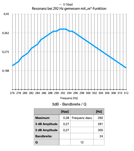 Das sieht ja schon nach einem Volltreffer aus – so viel Glück wünscht man sich. Offenbar haben wir bei 290, 292 und 294 Hz die maximale Ausgangsspannung von 0,38 Vpp. Genau so muss sich unsere Schaltung ja auch verhalten, weil der komplexe Widerstand Z bei Resonanz im Parallelschwingkreis maximal sein muss und daher die Spannung in diesem Ast des Spannungsteilers ebenfalls.