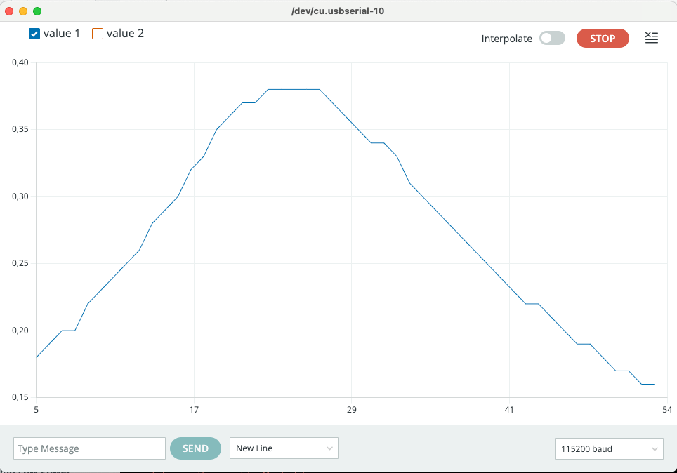 Das Ganze lässt sich auch über den seriellen Plotter des Arduino darstellen und sieht dann so aus: