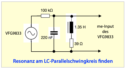 Nachdem der „Versatile Function Generator VFG9833“ so viel Interesse gefunden hat, möchten wir ihn selbstverständlich praktisch einsetzen. Und er soll neue Tricks lernen. In diesem Fall soll er den Resonanzpunkt eines Parallel-Schwingkreises aus einer Spule und einem Kondensator finden. Dazu beschalten wir unseren VFG wie folgt: