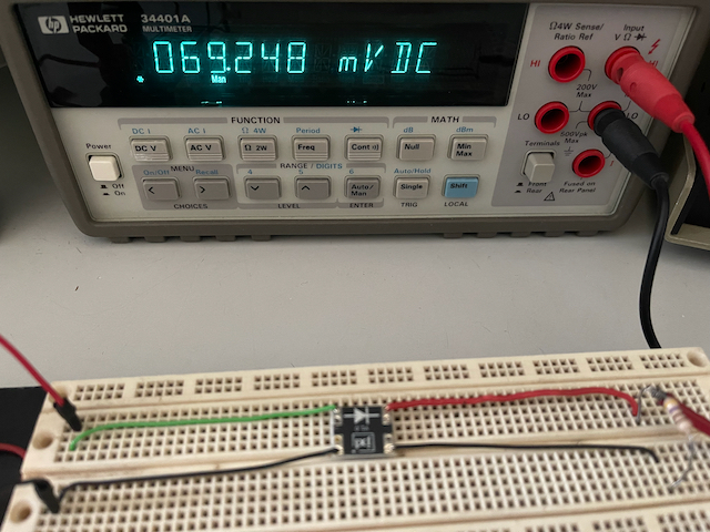 Das 6 1/2-stellige DVM misst die Differenzspannung am Eingang und Ausgang der „Diode“ (ich schreibe bewußt nicht „Anode“ und „Kathode“, denn es handelt sich nicht um eine klassische Diode). Man sieht, dass die Differenzspannung 0,069 mV beträgt. Wenn man zur Sicherheit die Eingangs- und Ausgangsspannung nachprüft, bekommt man eine Eingangsspannung von 15,328 V und eine Ausgangsspannung von 15,259 V – wenig überraschend, aber als Gegenprobe ok.